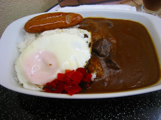 業務用のカレーにウインナーが2本と目玉焼きがのります。