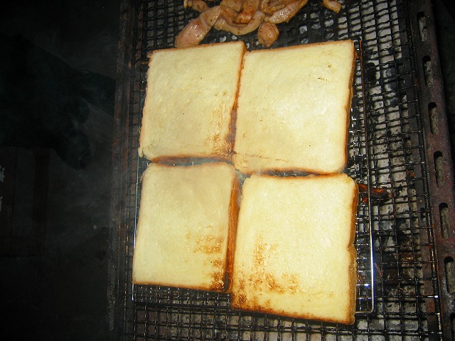 雫で買ったパンを焼きます。パンに肉を挟んで食べたり、マーガリンを