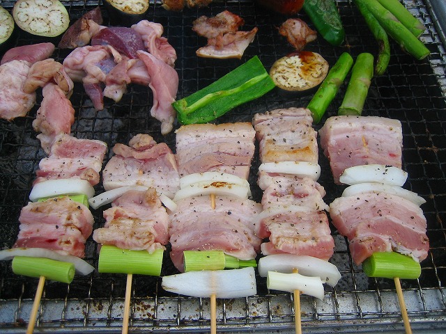 常連の特権で仕入れた串と、自分で朝仕込んだ豚串、ホルモンや野菜な