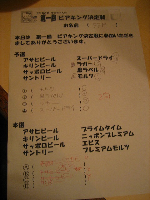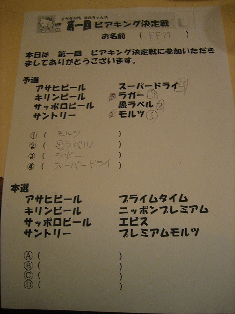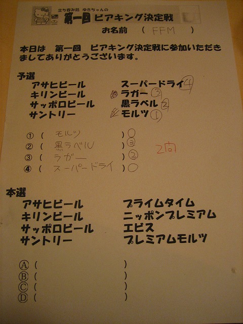 まずは予選があり、ビール4社の主力ビールの飲み比べです。