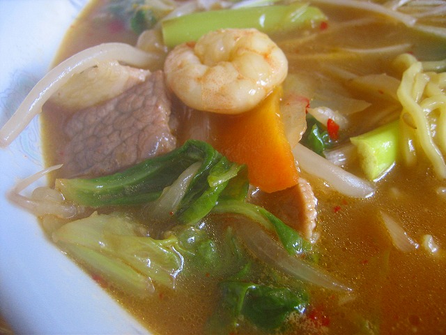 五目ラーメンのように豚肉、海老、各種野菜ものってます。