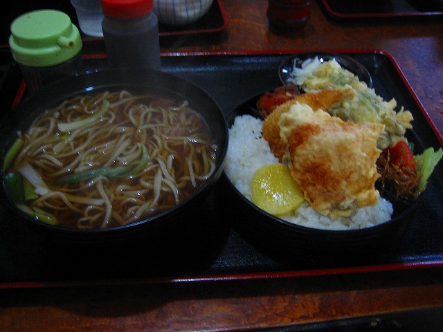 大きなちょうちんの入物に2段重で、そばとご飯・おかずが付いてます。