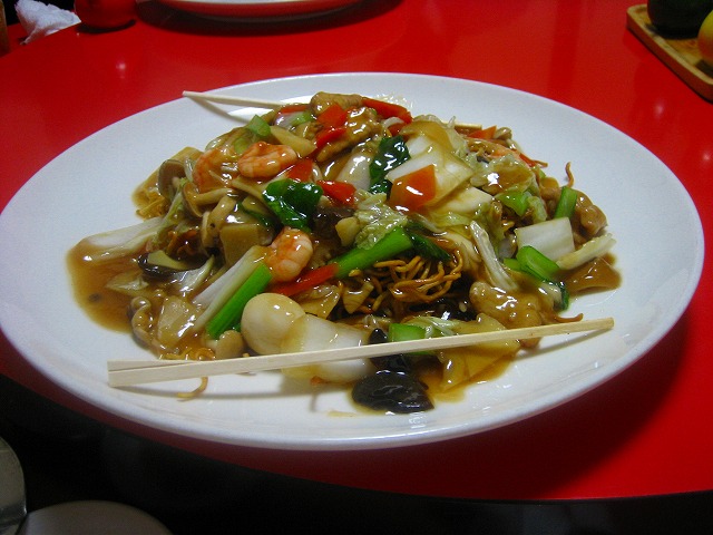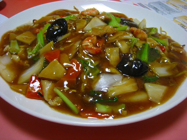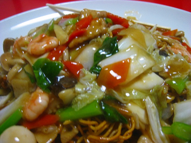 しっかり炒められた麺に彩りの良い野菜などが入ったあんがのります。