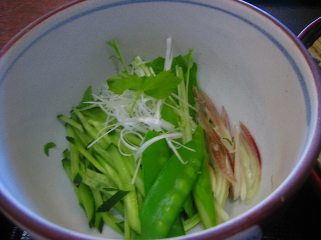 さっぱりしたシャキシャキ野菜をたれに浸けていただきます。