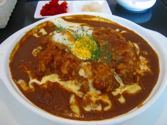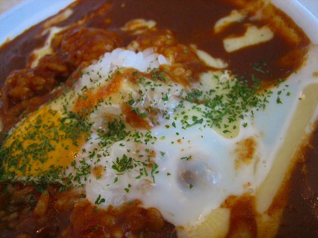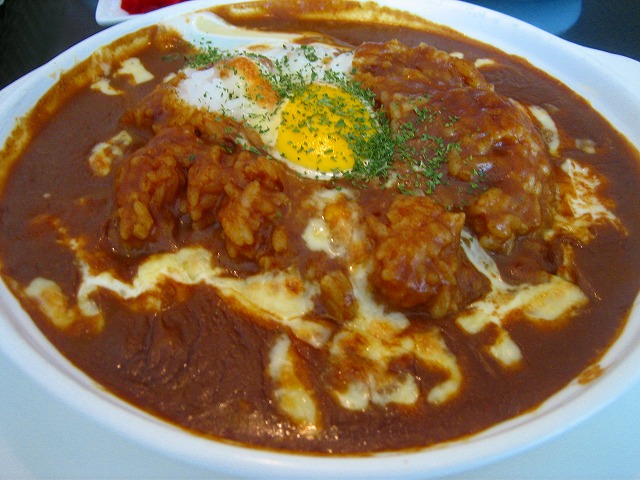 カレーの上に卵とチーズがのり、表面をオーブンで焼かれます。