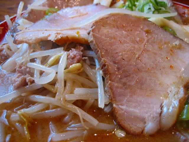 歯ごたえのあるチャーシューに挽肉が入ったもやしがのります。