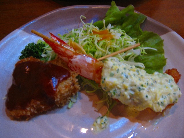 揚げたてのエビにタルタルソース。カツにデミグラソースが添えられます。