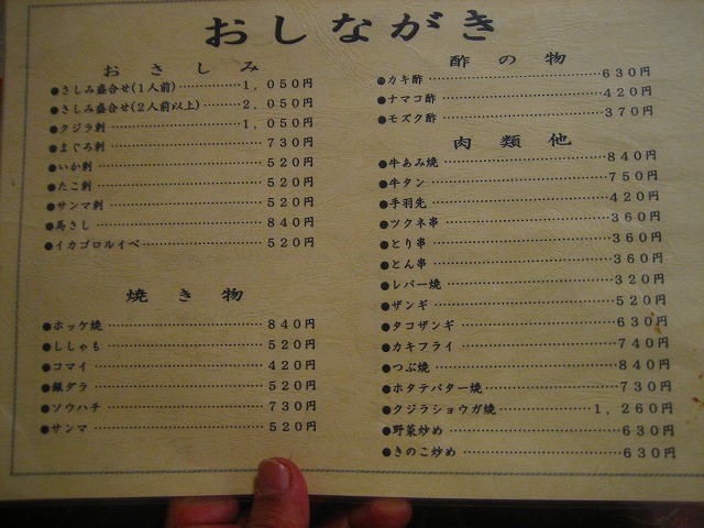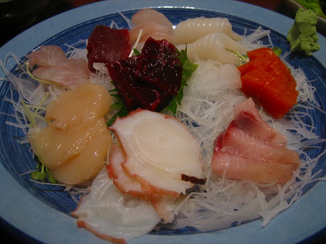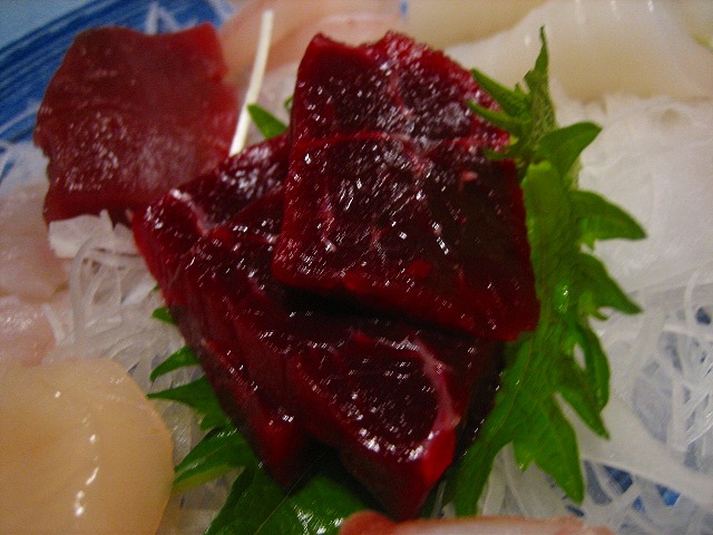 クジラも入っている刺身盛り合わせ。どれも新鮮で美味しい!。