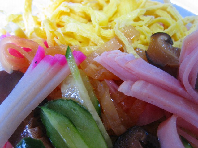 具は、かまぼこ、ハム、くらげ、玉子、キュウリ、しいたけなど小さい