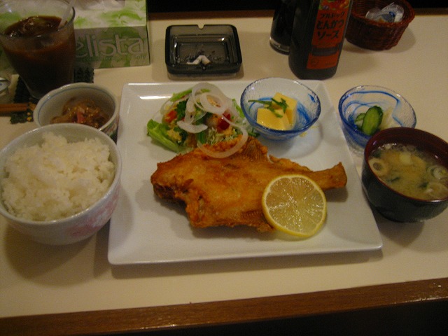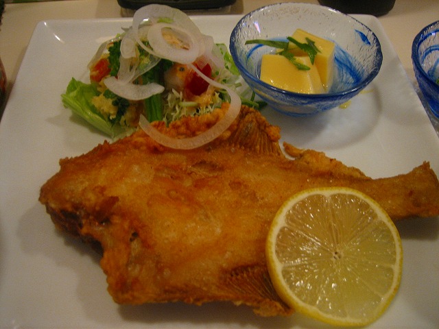 魚系のメニューから、カレイの唐揚げにしました。小鉢が3つとサラダが