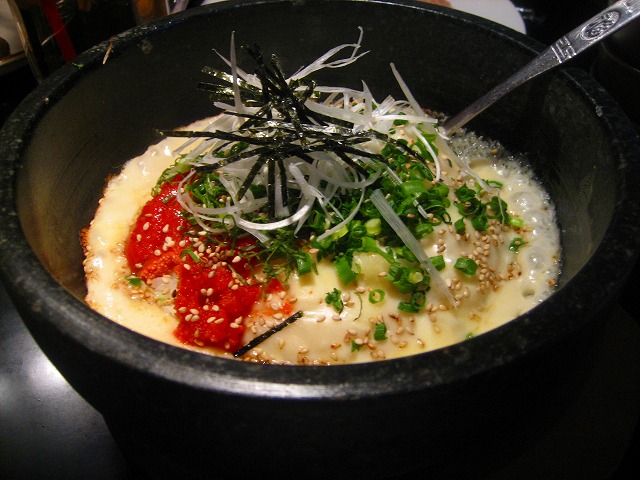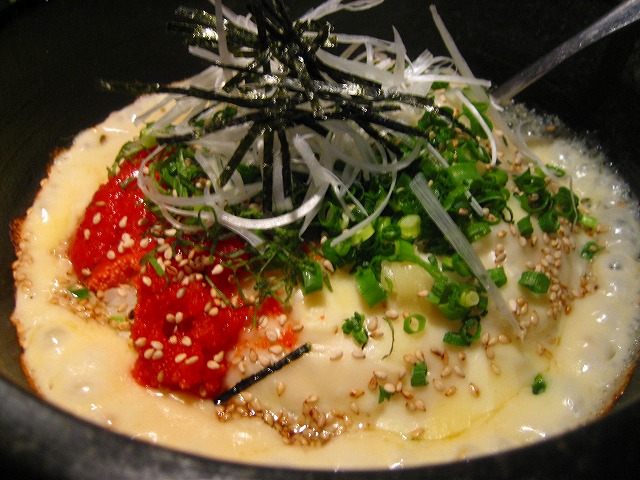 熱々の器に明太子とチーズがのせられ、混ぜて食べると美味い!。