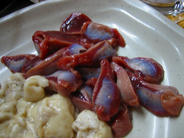 左:鳥串モツ込み(¥80×10)右:鳥串精肉(¥90×10)
