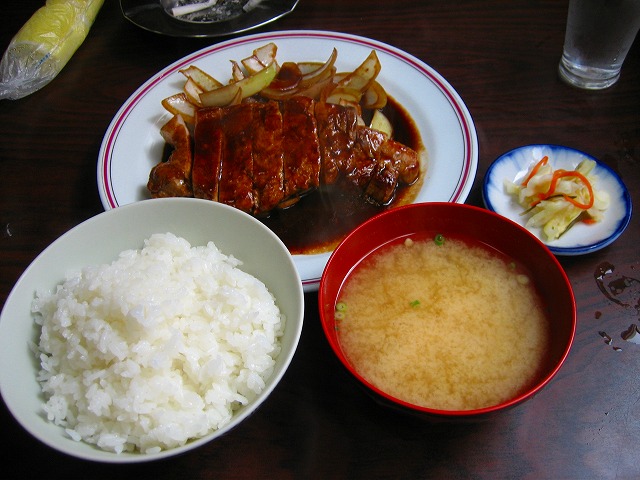 ウスターソース系の味付けにシンプルにタマネギが添えられています。