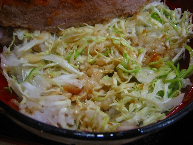 カツを避けるとキャベツが引いてあり、その下のご飯があります。