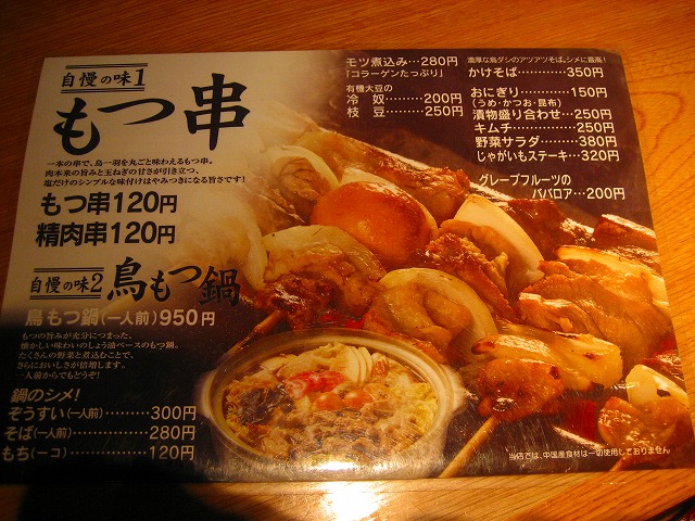 メインが、もつ串と鳥もつ鍋で、メニューがおっさん臭いかもしれませ