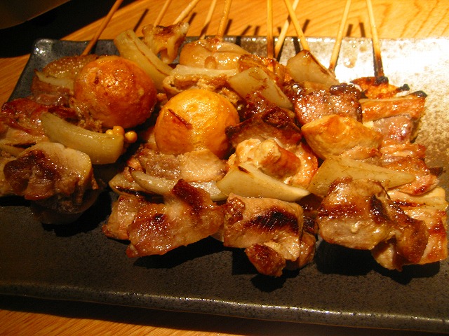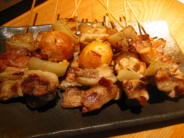 レバー、砂肝、きんかんなどが1本の串で味わえる串です。