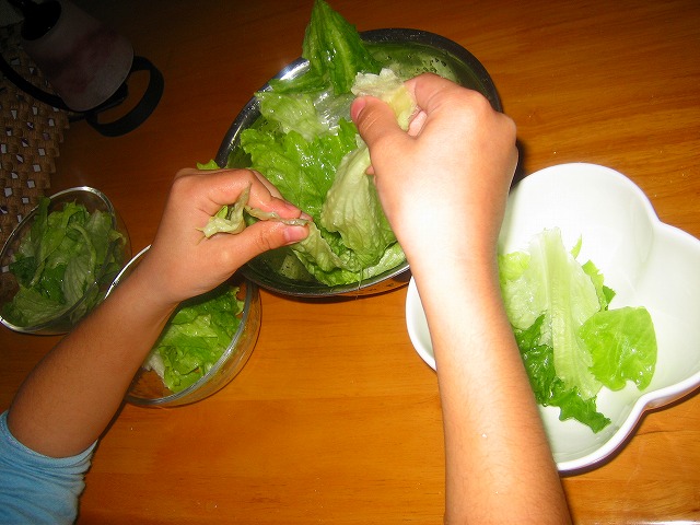 火の調理は、まだ危ないので、サラダの盛り付け係りになってもらいました。