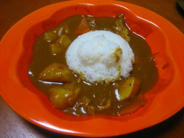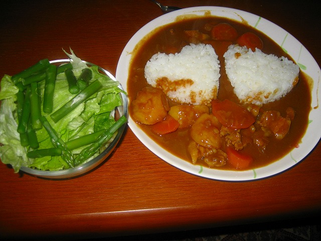コトコトカレーを煮込んで出来上がり!。娘がご飯を盛り付けます。