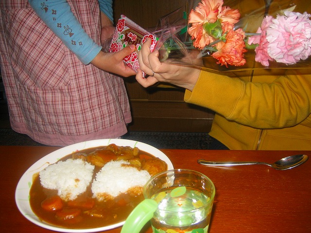 サプライズとして、娘がおこずかいでカーネーションを買い、OKUSAMA
