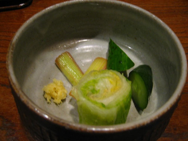 漬け物です。これが結構美味しいです。山わさびと一緒に食べて、おかわ