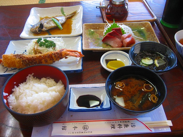 名物エビフライを始め、刺身、煮魚、もずくなどが付いていました。