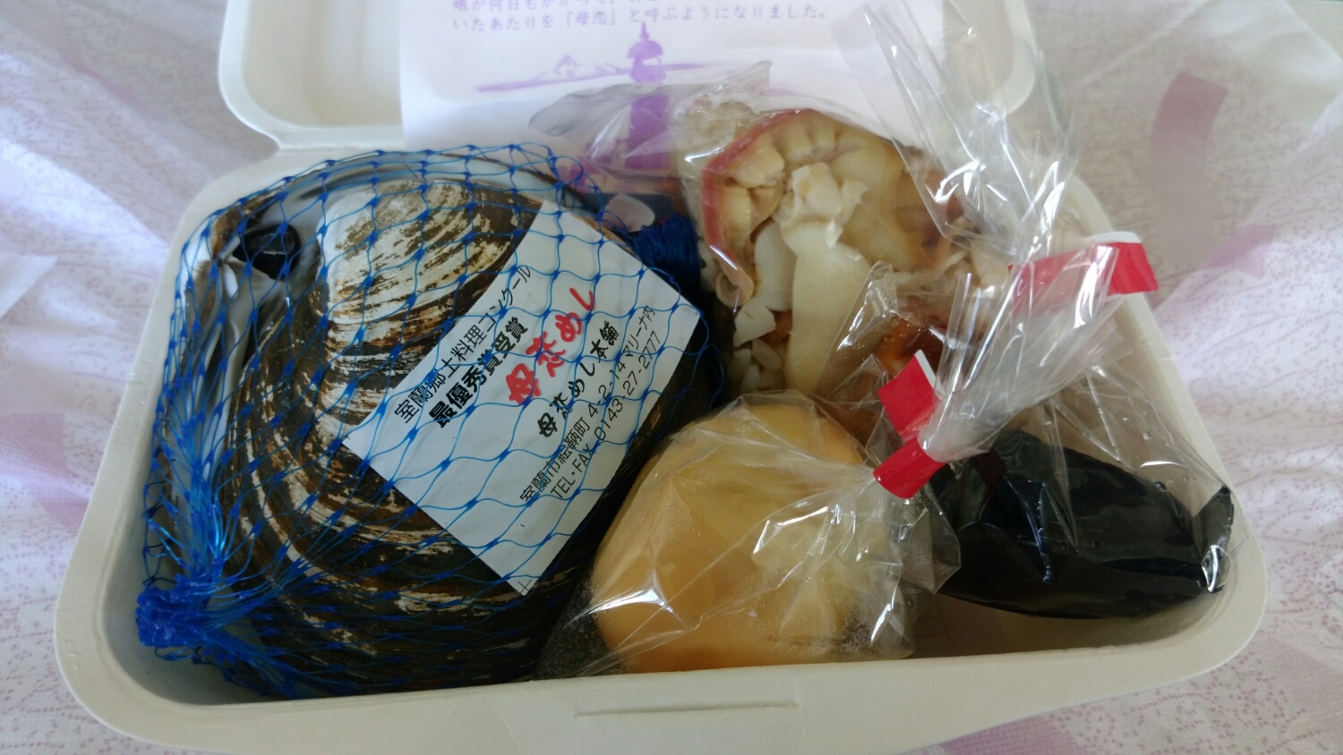 ホッキ貝の中にホッキ飯のおにぎり。外にもう一つ。スモーク玉子と漬物です。