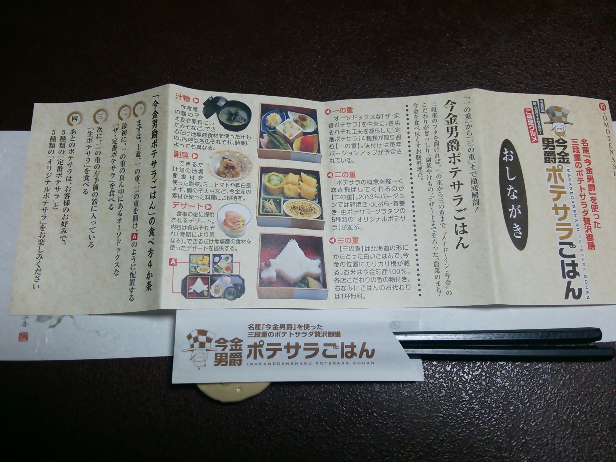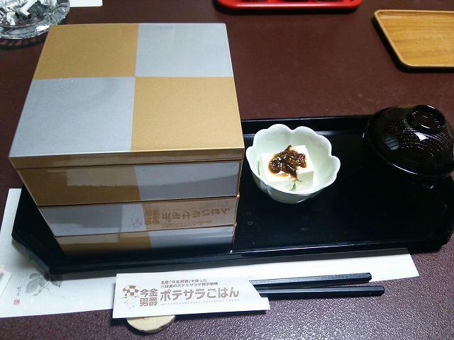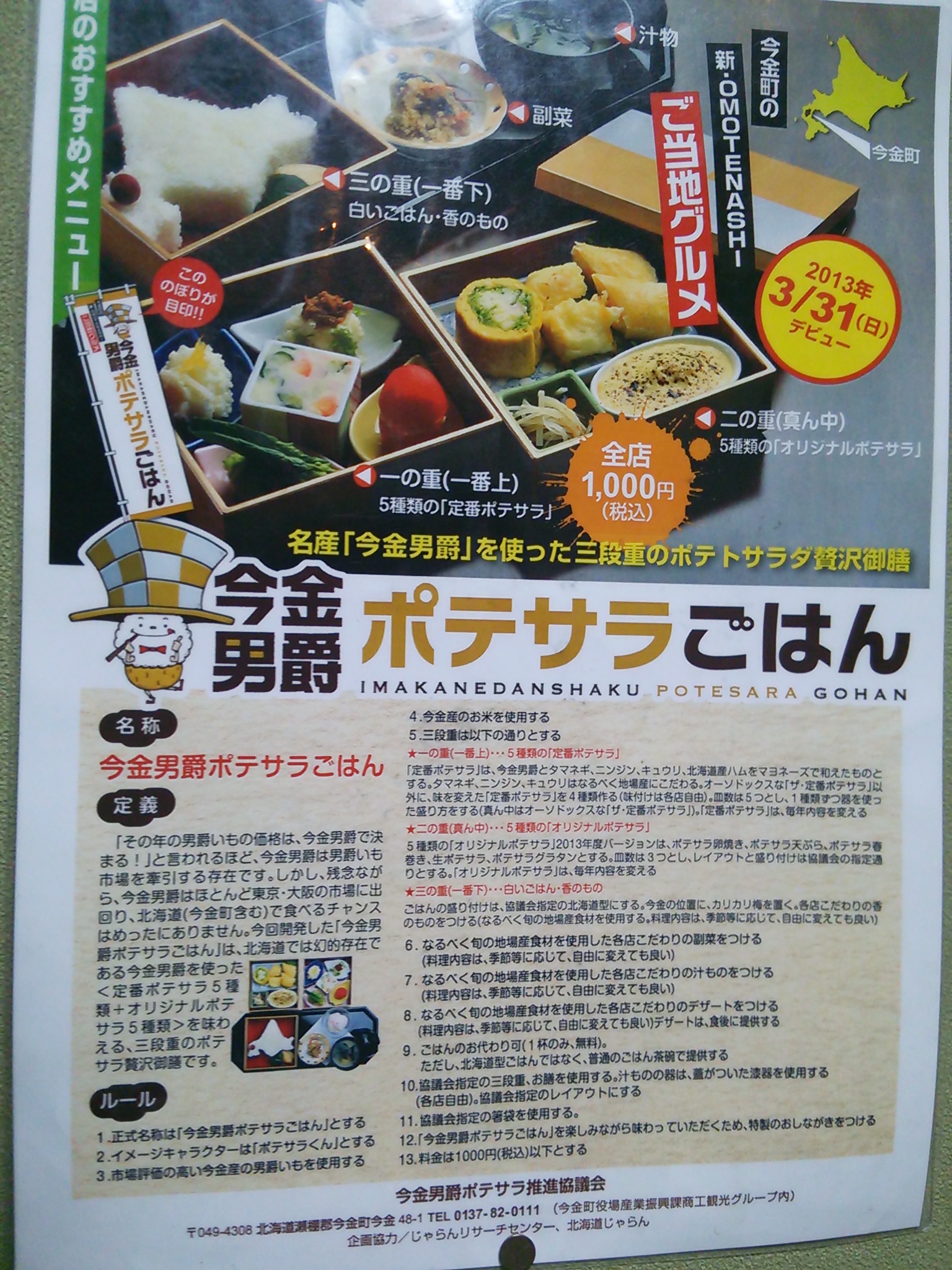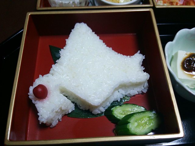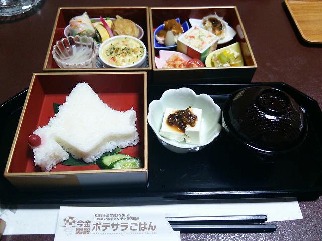 今金町のご当地グルメです。ポテトサラダを工夫した料理のオンパレードです。北海道型のご飯に、小梅が今金町の位置に置かれています。