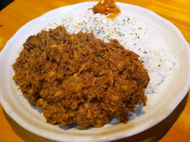 一口食べたのですが、ルーカレーでもなく、スパイスと鶏肉を長時間煮込んだカレーとのことです。濃厚な鳥肉の風味とスパイスの辛みが絶妙です。これは旨かった!。キーマカレーに近い感じですが、チキンカレーでこの様なタイプは初めて食べました。