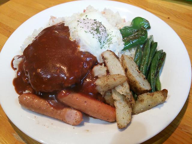 ガーリックライスの上に、ハンバーグ・ソーセージに目玉焼きがのって、デミグラスソースがかかってます。