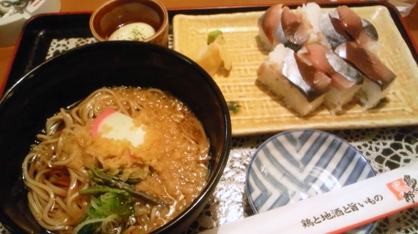 鳥太郎札幌北口店での日替ランチ。鯖の寿司と狸そば。