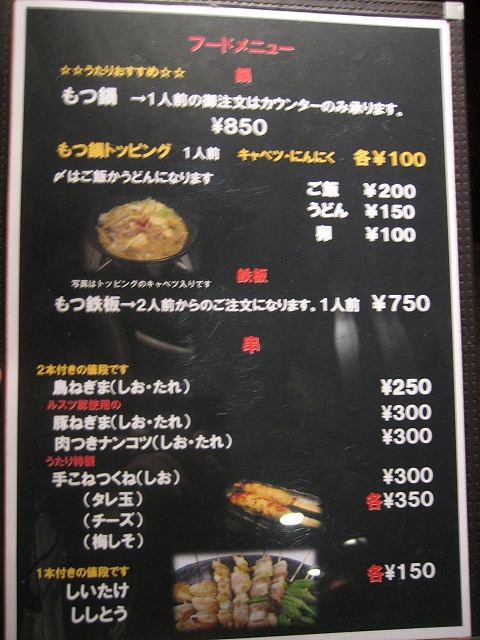メニューには、もつ鍋・やきとりのほか居酒屋メニューもありました。