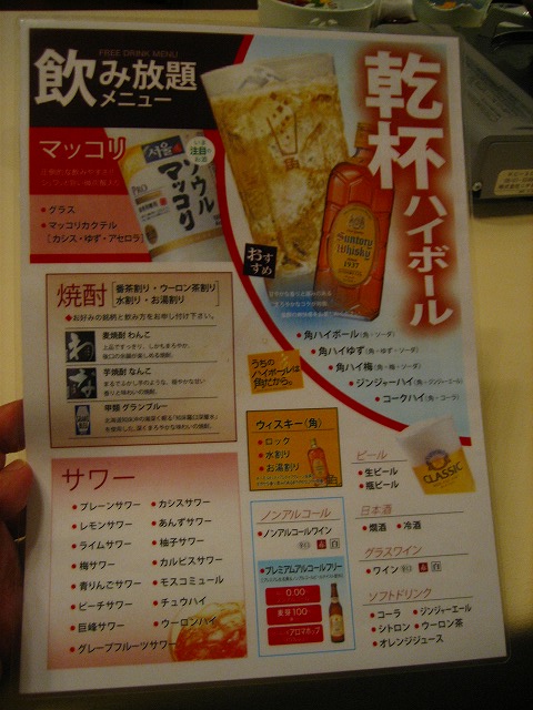 飲放メニューは、生ビールの他、サワーやハイボールが充実してます。