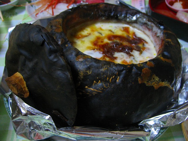 カボチャを丸ごと自家製ナンといっしょに食べます。