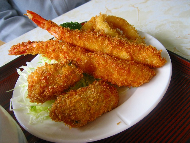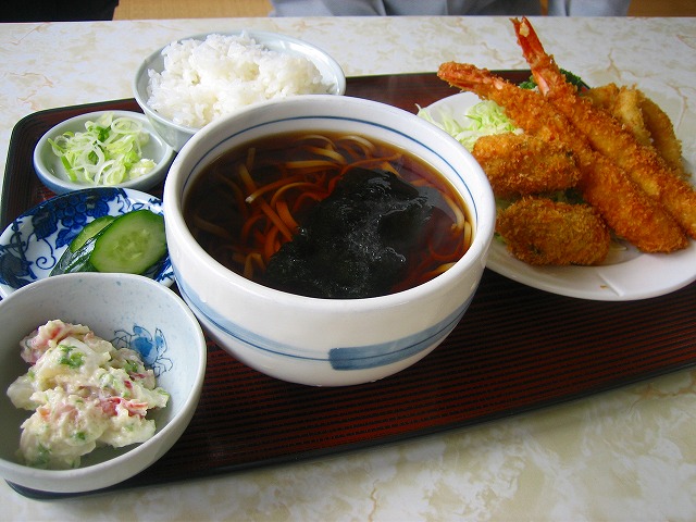大きなエビ、イカ、カキのフライに手打ちそば、ご飯、小鉢とボリュームいっぱいです。