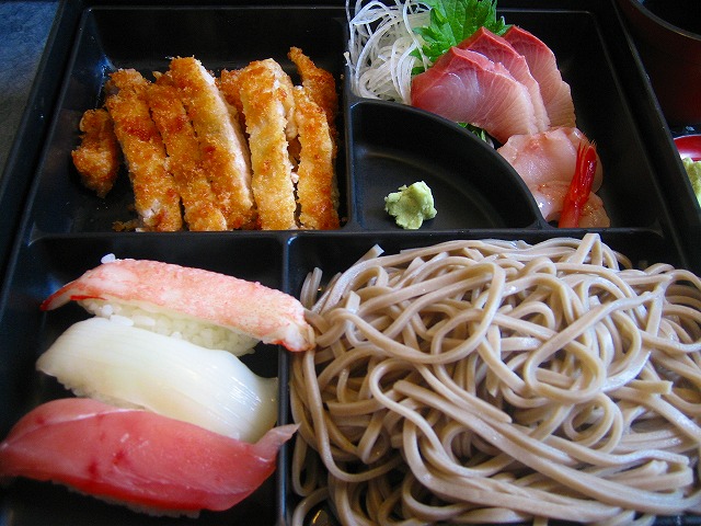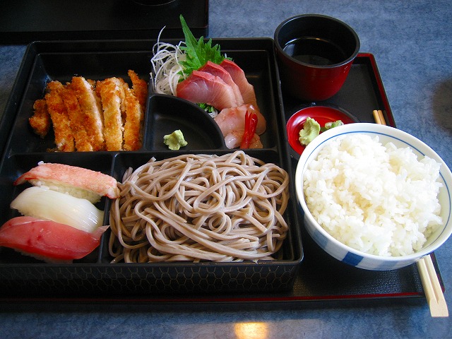 寿司に新鮮な刺身、揚げたての豚カツ、蕎麦が付いて、ライスもサービスです。何ともよくばりました。