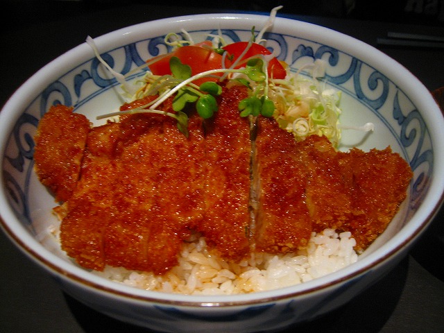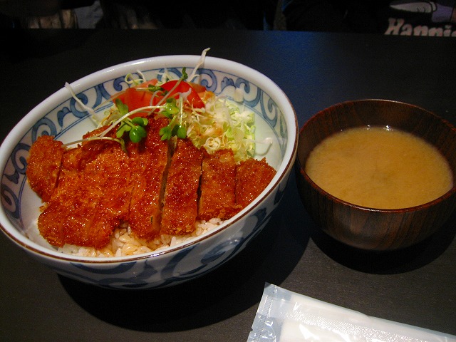 キャベツの上にカツがのり、オリジナルソースのカツ丼です。