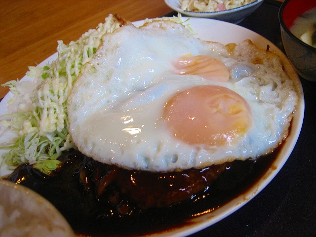 2個の目玉焼きの中にハンバーグが隠れています。
