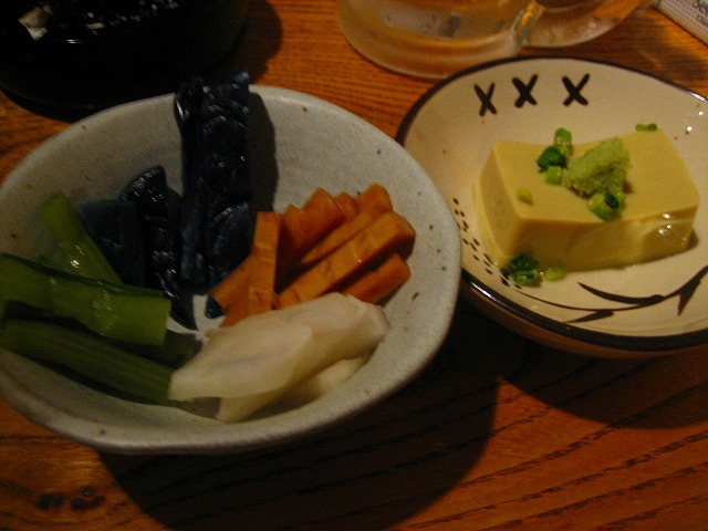 つけものとカニ味噌豆腐です。日本酒に良い感じに合います。