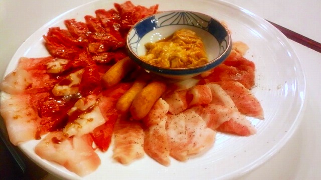 手作りのお通しです。そして、お肉の準備ができました!。