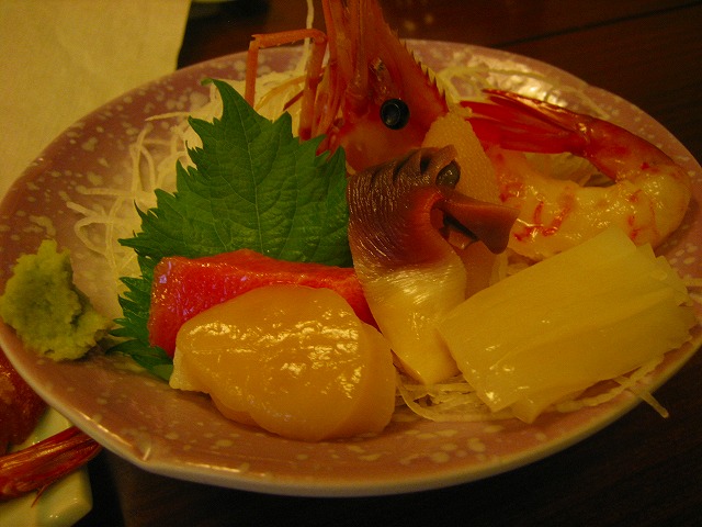 大きなボタンエビを始めとしたお刺身。鮮度も良いです。