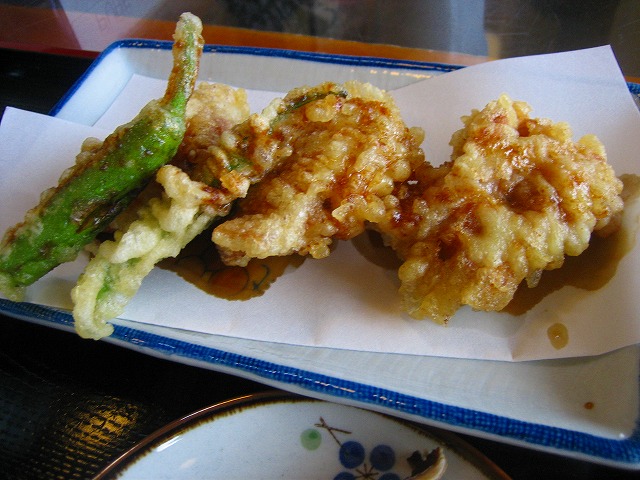 揚げたての天ぷらに甘めのたれがかかっております。
