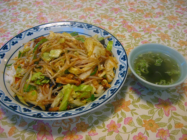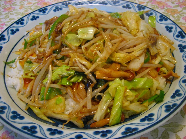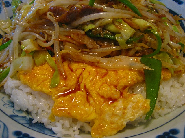 濃いめに味付けした野菜炒めの下に玉子焼きが入っています。