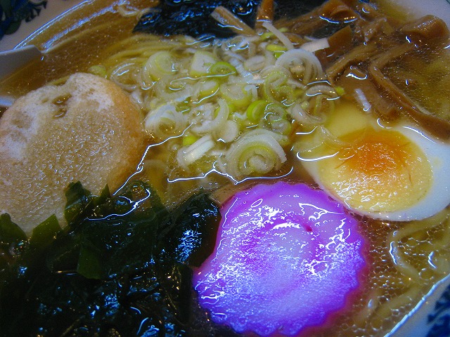 メンマ、ワカメ、なると、ゆで卵、ふがトッピングされています。