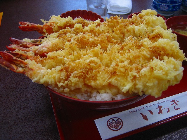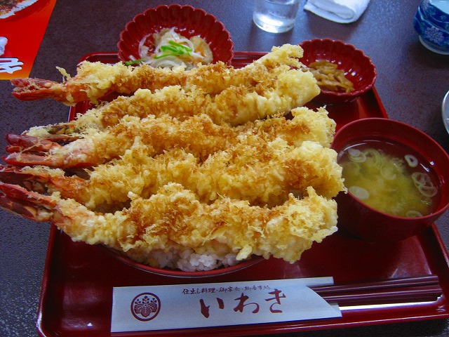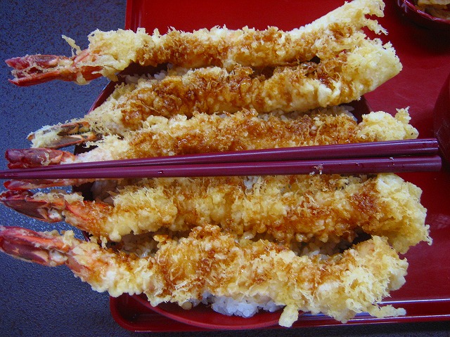 大きなエビが5本。ドンブリのご飯を覆って中が見えない位です。