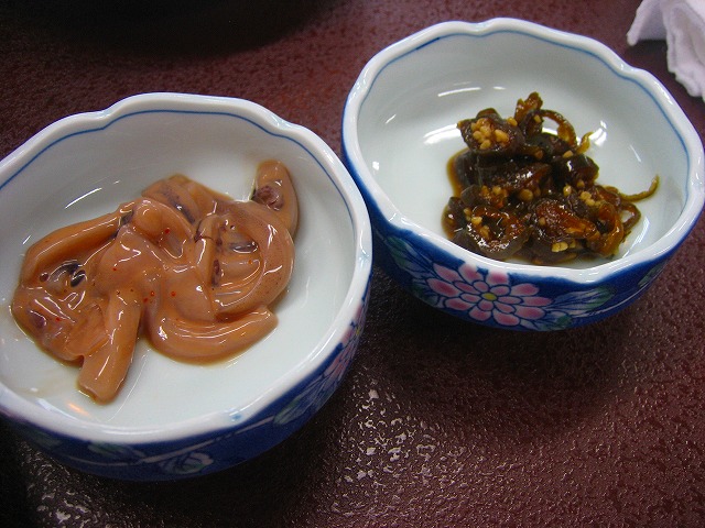 サービスの塩からとさんじょう漬けで味にアクセントを付けながら食べました。