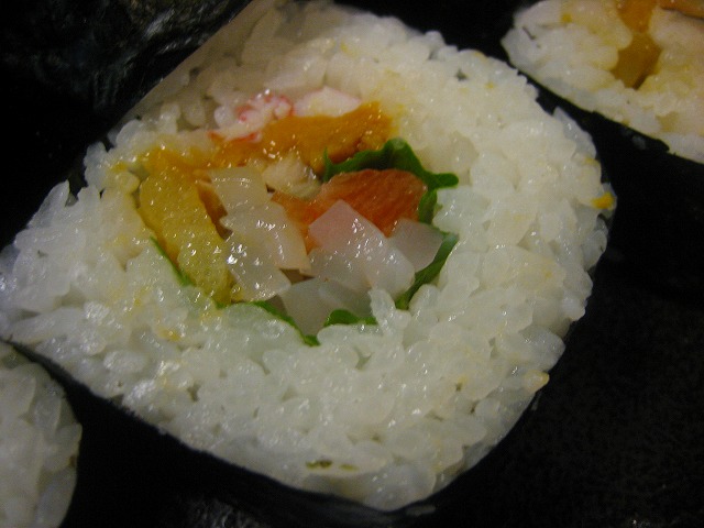 大きな生太巻きにウニ、イカ、サーモンなどが宝石箱のように詰まってます。
