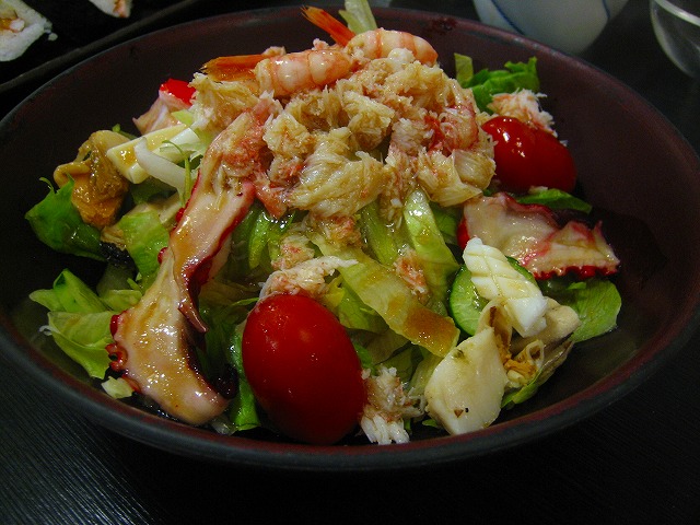 エビ、カニ、イカ、タコなどの海鮮がたっぷり乗ったサラダです。