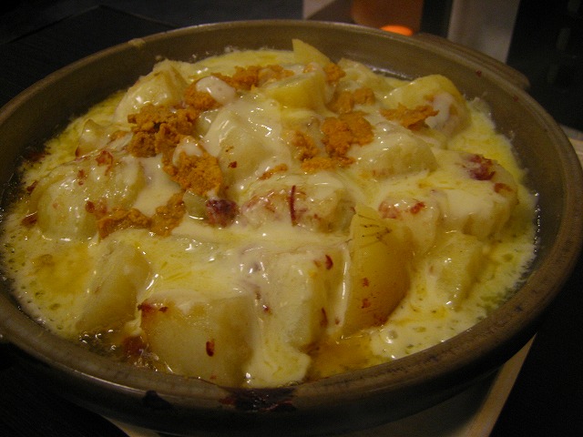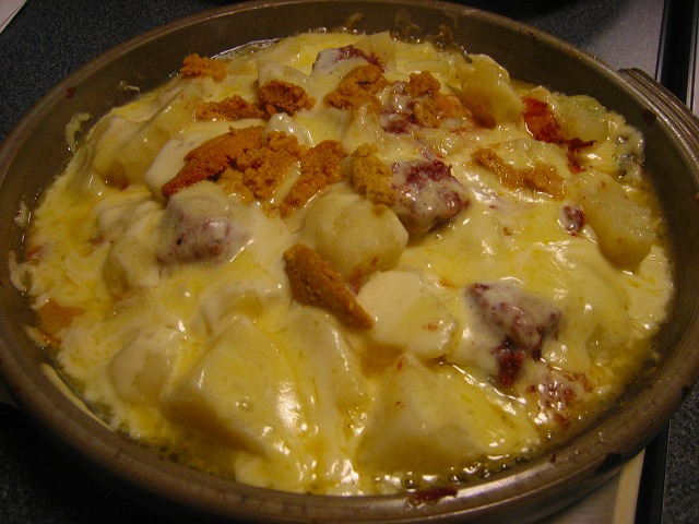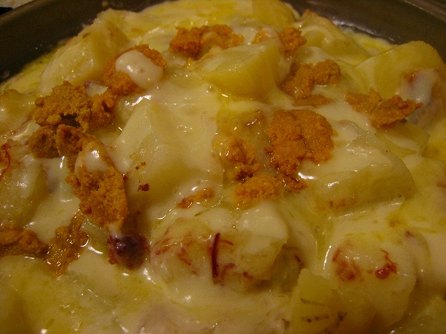 アッアツの鉄板の上にジャガイモとたっぷりかかったチーズがとろけ、うにが乗ります。