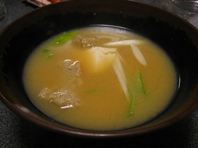 〆はすり身汁です。