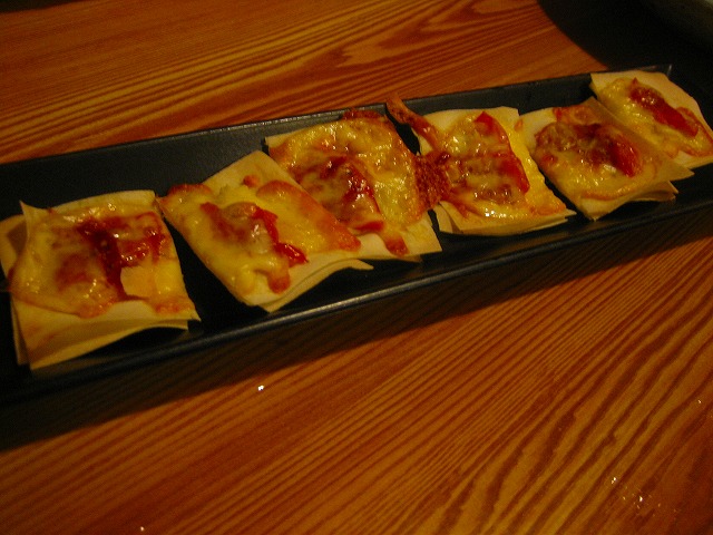 春巻きの皮のパリパリピザです。